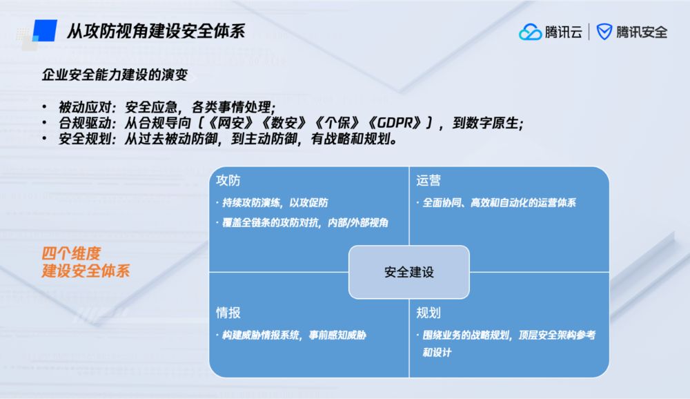 最后一个层次是情报。情报对安全能力的建设,包括运营是起着非常重要的作用,特别是在户网外,以及日常化的运营当中。