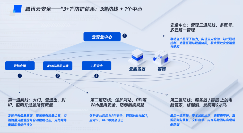2022年,腾讯云安全发布云安全中心,打通了云防火墙、云WAF、云主机安全三道防线,实现了云安全产品的一体化。