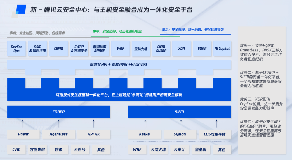 今年,腾讯云安全升级发布“全域安全”解决方案,将云安全中心与主机安全合二为一,打造了CNAPP+SIEM的安全一体化平台及可插拔式安全底座,企业可在底座上层“乐高式”搭建安全产品模块,实现公有云、混合云、自研云的多云统一管理,以及横跨生产网、办公网、互联网的三位一体防护,即“全域安全”。