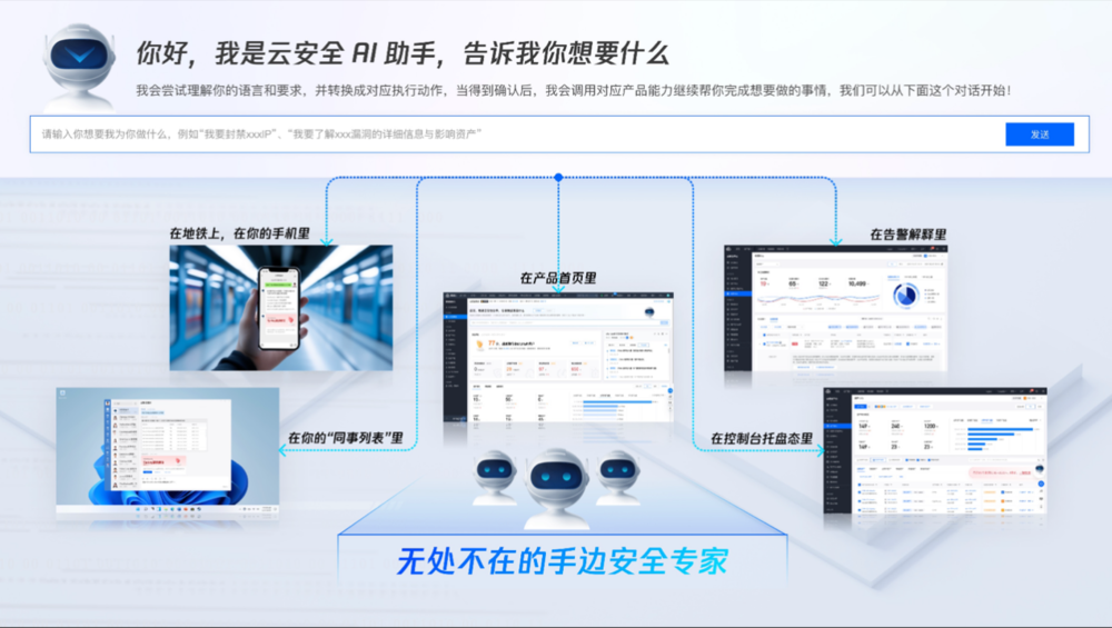 第二类是硬核场景,即需要安全专业能力和经验判断的工作,例如告警解释、事件溯源分析、应急响应等,都可以交给腾讯云AI安全助手来进行辅助。