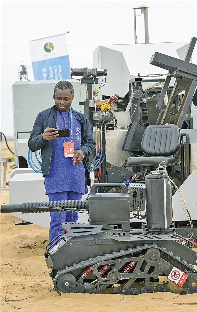 参会嘉宾在以路治沙示范区了解科学治沙新技术。